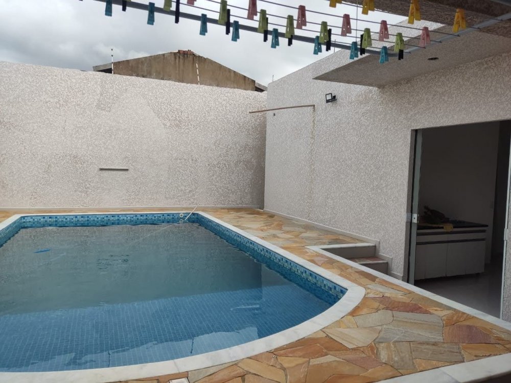 Com piscina, banheiro e churrasqueira.
