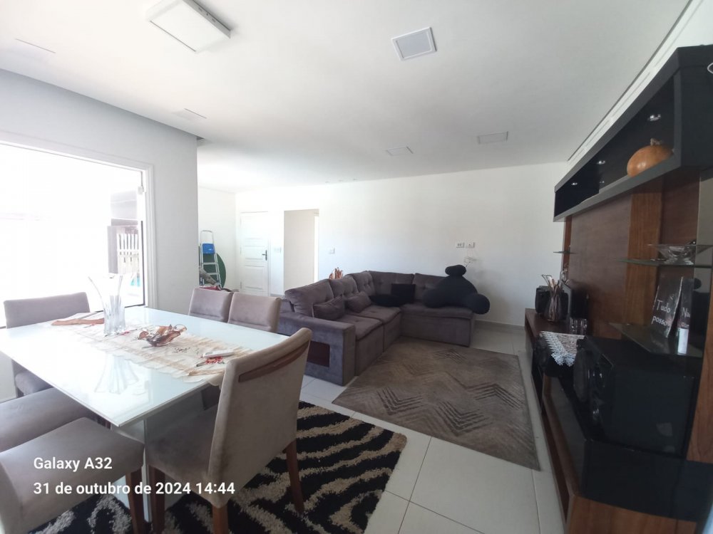Imóvel térreo com quatro dormitórios, sala dois ambientes, dois banheiros, cozinha integrada com a área gourmet, piscina e garagem para um carro.